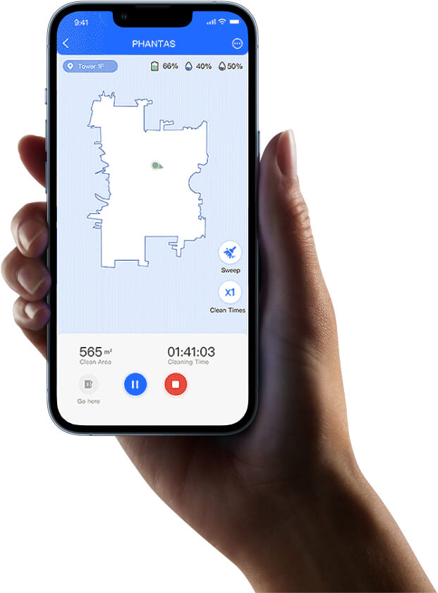 Dedykowana aplikacja umożliwia sterowanie czyszczeniem podłogi z dowolnego miejsca i o każdej porze. Oferuje mnóstwo opcji, takich jak edycja mapy, zdalne sterowanie, planowanie zadań, raportowanie danych itp.